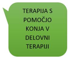 DELOVNA TERAPIJA S POMOČJO KONJA vključuje aktivnosti ob konju in na konju, ki so prilagojene sposobnosti izvedbe aktivnosti. Delovni terapevt oceni kaj posameznika podpira in kaj ovira pri sodelovanju v aktivnostih ob in na konju in uvede prilagoditve, ki omogočajo posamezniku, da zmore več.