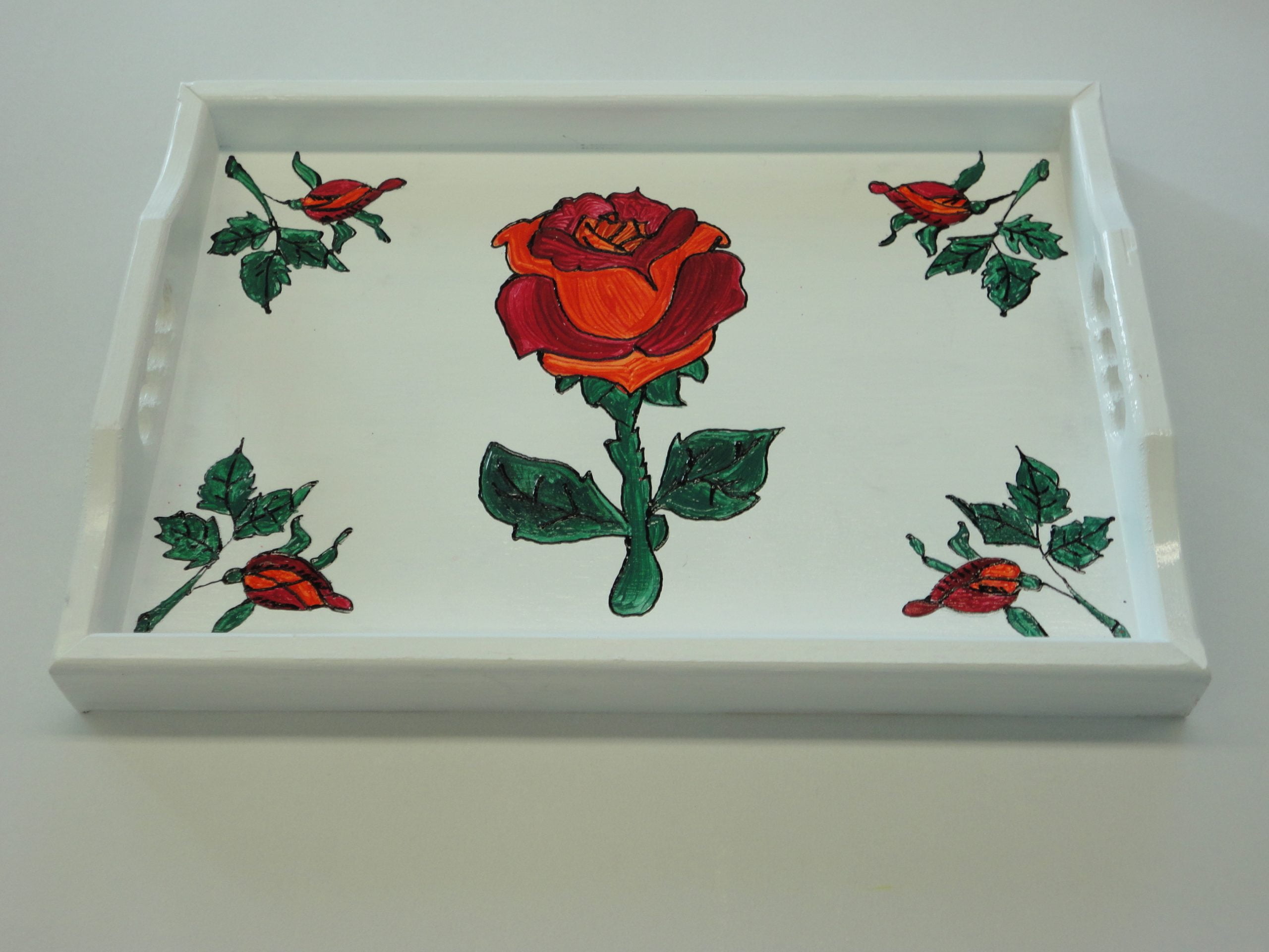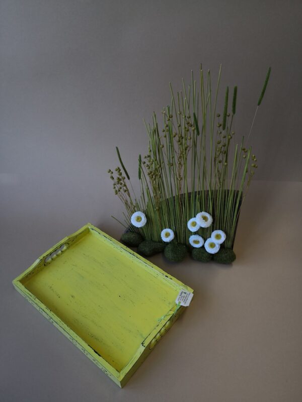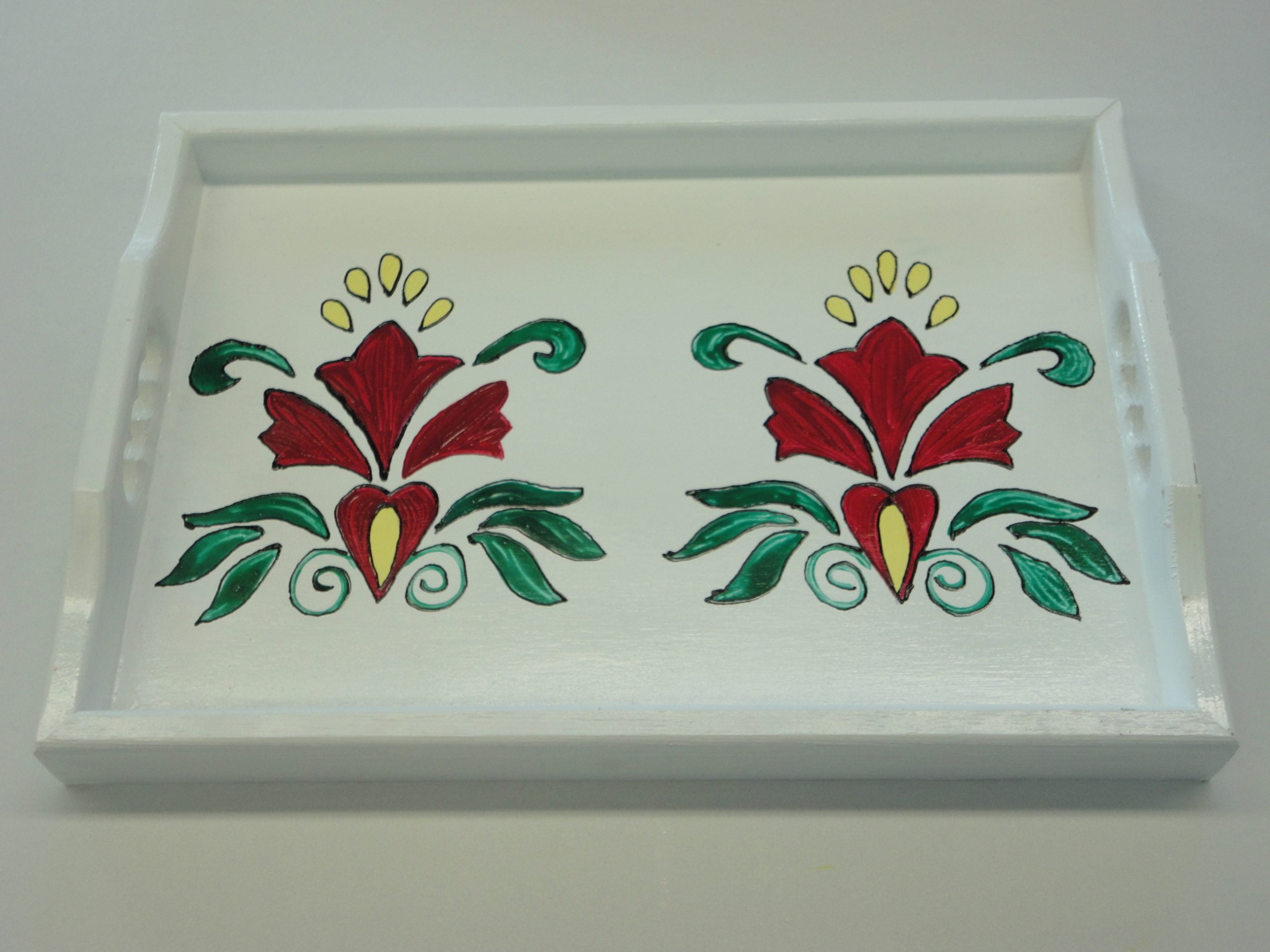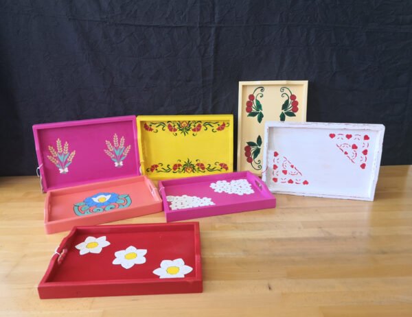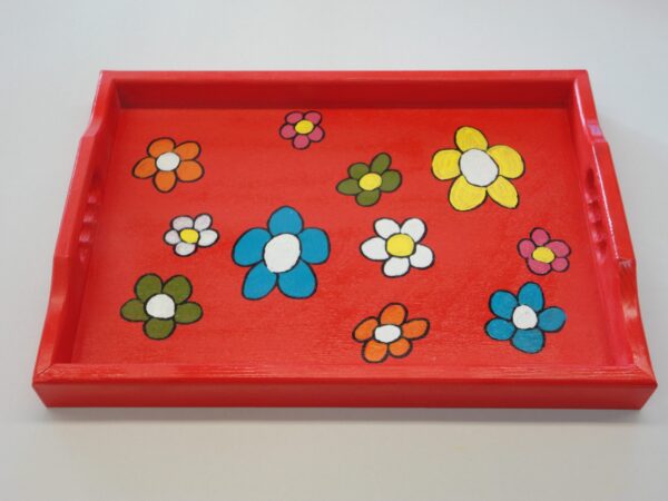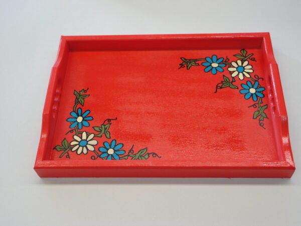 Pladenj mali, dimenzija 35,5 x 25 izdelan iz smrekovega lesa, barvan z različnimi odtenki, uporabljena tudi starana tehnika